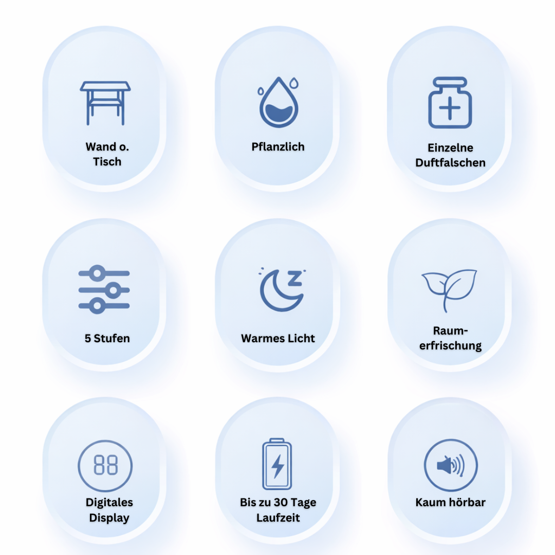Wechsle Düfte jederzeit. Passe die Intensität an. Genieße Ruhe, Schutz und Entspannung – jeden Tag.