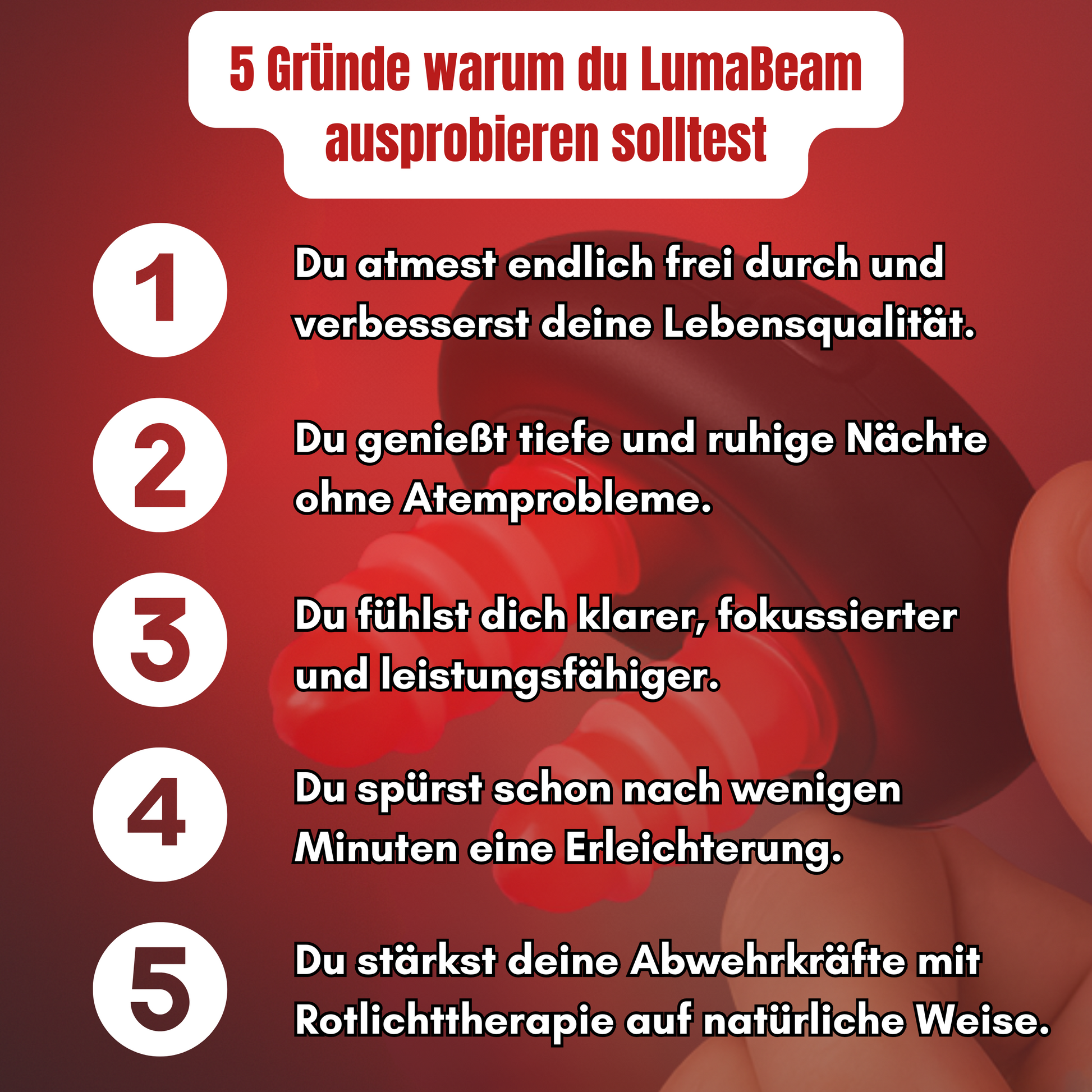 Du wachst auf, atmest tief ein – frei, klar, ohne Druckgefühl. Dein Kopf ist leicht, dein Tag beginnt energiegeladen. Genau das ist die Freiheit, die LumaBeam dir schenkt.